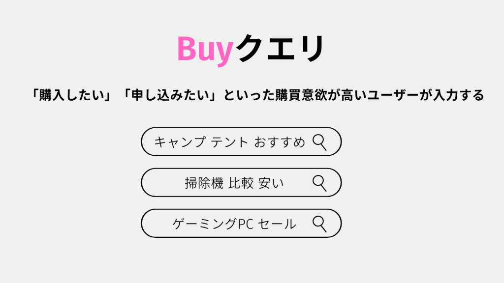 Buyクエリは「購入の意欲」が高いユーザーが検索するキーワードです。具体的には: