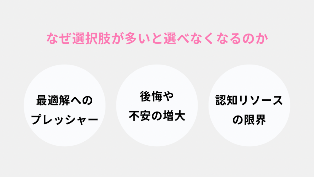 人が多くの選択肢を前にすると、次のような心理的要素が働きます。