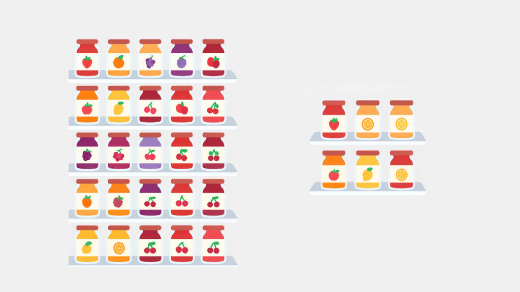 ジャムの法則という名前は、コロンビア大学のシーナ・アイエンガー教授による1995年の実験から広まりました。アメリカのスーパーマーケットでジャムの試食ブースを出し、時々で置くジャムの種類を変えたのです。あるときは24種類という豊富なバリエーションのジャムを並べ、別のときは6種類だけに限定しました。その結果、意外なことに、ジャムの種類が少ない方が、はるかに購入率が高かったのです。