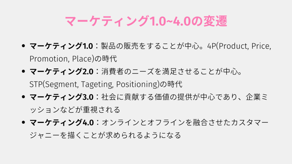 マーケティング5.0を理解するには、その前段階となる1.0から4.0の流れを把握することが大切です。