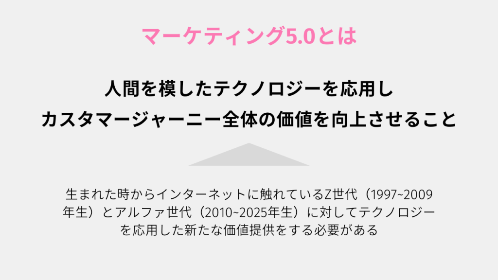 「マーケティング5.0」は、急速に進化するテクノロジーと新しい世代のライフスタイルに合わせたマーケティングアプローチを示しています。特に、生まれたときからスマートフォンやインターネットに親しみ、SNSを当たり前に活用しているZ世代(1997~2009年頃生)やアルファ世代(2010~2025年頃生)の消費行動が従来の世代とは大きく異なることに着目しています。