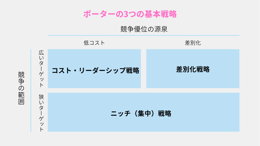 ポーターの3つの基本戦略とは、「コストリーダーシップ戦略」「差別化戦略」「ニッチ戦略(集中戦略)」のことです。これらは「競争優位の源泉が低コストか差別化か」と、「競争する範囲が広いか狭いか」という2つの軸で整理されています。