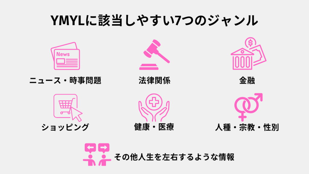 YMYLとして捉えられやすいカテゴリーは、大まかに次の7つが挙げられています。必ずしもこれらがすべて検索に反映されるわけではありませんが、理解しておくと対策が取りやすいでしょう。